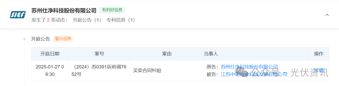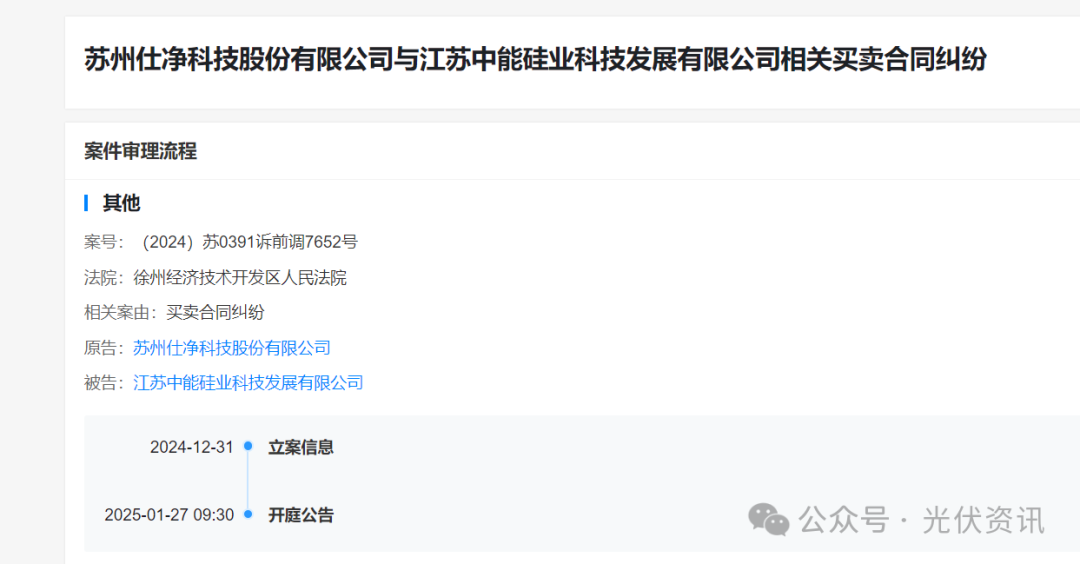 据了解,苏州仕净科技股份有限公司与江苏中能硅业科技发展有限公司存在相关买卖合同纠纷,仕净科技状告江苏中能,审理法院为徐州经济技术开发区人民法院,该案件将于1月27日开庭。