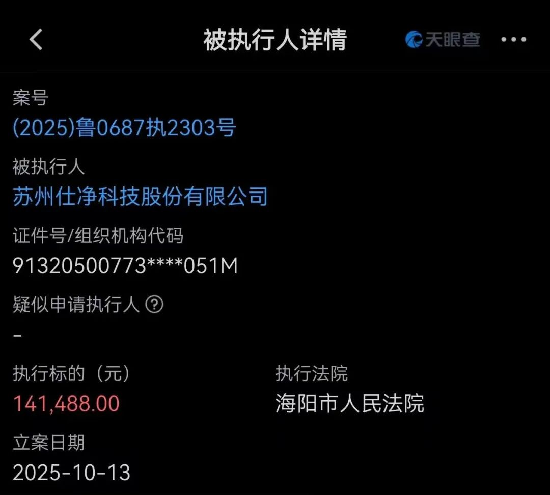 据了解,该案件于10月13日立案,苏州仕净科技股份有限公司被列为被执行人,执行标的141,488.00元,案号为(2025)鲁0687执2303号,执行法院为海阳市人民法院。
