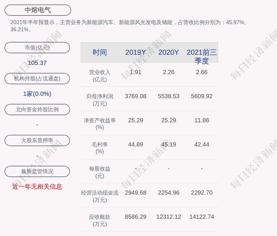2021年半年报显示,中熔电气的主营业务为新能源汽车、新能源风光发电及储能,占营收比例分别为:45.97%、36.21%。