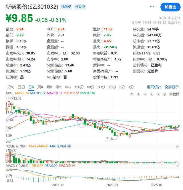 在二级市场上,新柴股份的股价表现相对稳定。截至某交易日上午9点35分,公司股价报9.85元/股,下跌0.61%,最新市值为23.73亿元。尽管面临高管的减持计划,但公司股价在近一年内仍累计上涨超过六成。