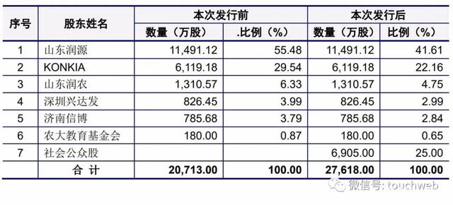 IPO前,山东润源持股55.48%,KONKIA持股29.54%,山东润农持股6.33%,深圳兴达发持股3.99%,济南信博持股3.79%,农大教育基金会持股0.87%。