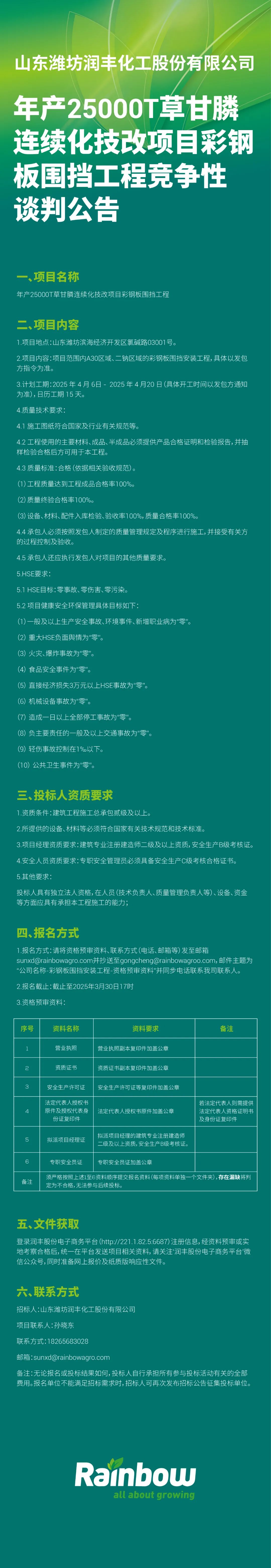 润丰股份年产25000T草甘膦连续化技改项目彩钢板围挡工程竞争性谈判公告