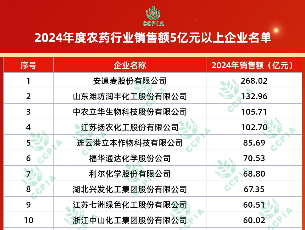 润丰股份蝉联2024年度农药行业销售额5亿元以上企业名单第二名