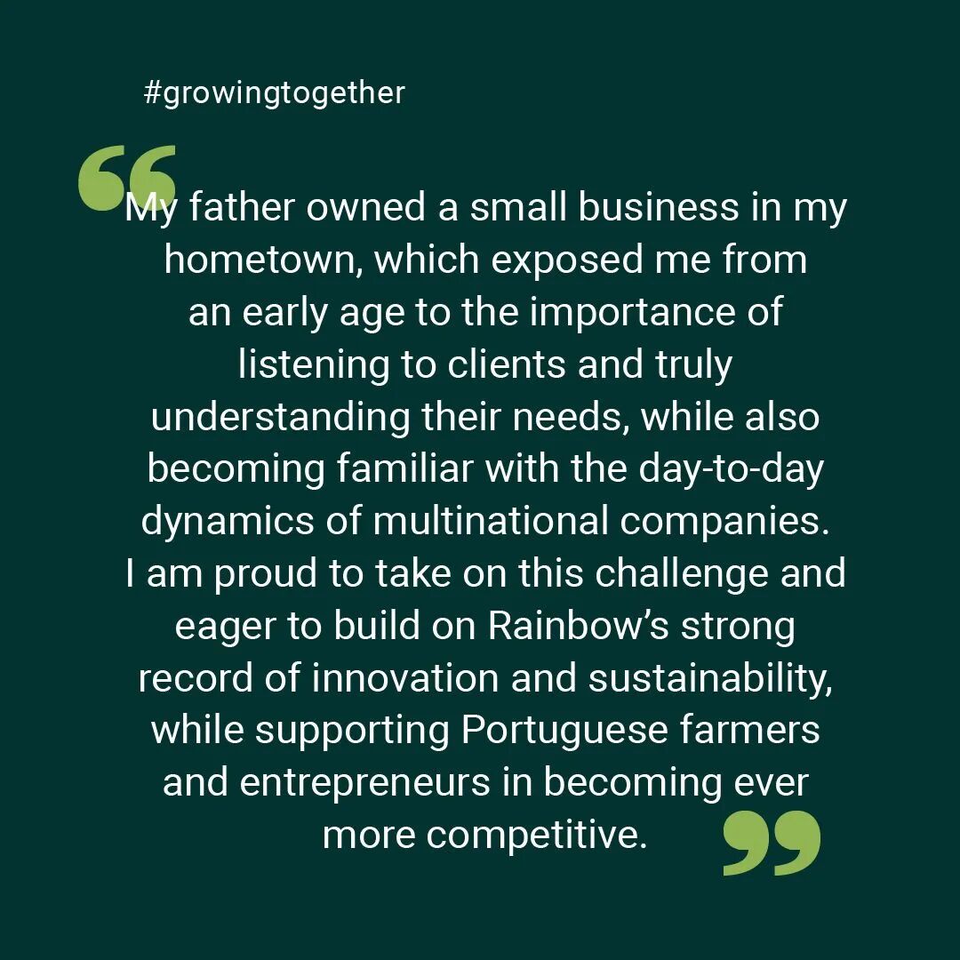 谈及新职,他表示:“我的父亲在家乡经营着一家小型企业,这让我从小就深知倾听客户诉求、真正理解其需求的重要性,也早早熟悉了跨国企业的日常运营节奏。我为能迎接这一挑战倍感自豪,也热切期待在Rainbow深厚的创新积淀与可持续发展的坚实基础上再接再厉,同时助力葡萄牙的农户与农业从业者不断提升市场竞争力。”
