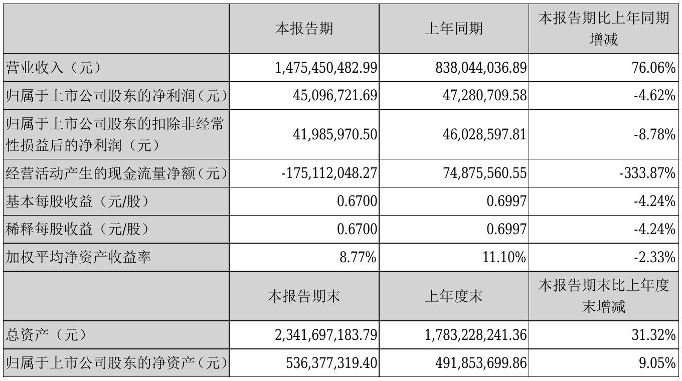 挖贝网8月29日,保立佳(301037)近日发布2021年半年度报告,报告期内营业收入1,475,450,482.99元,同比增加76.06%;净利45,096,721.69元,同比净利减少4.62%。