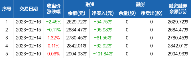融资方面,当日融资买入29.65万元,融资偿还84.41万元,融资净偿还54.75万元,连续6日净偿还累计430.01万元。融券方面,融券卖出0股,融券偿还0股,融券余量0股,融券余额0元。融资融券余额合计2629.72万元。