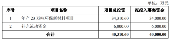 保立佳昨晚披露的向不特定对象发行可转换公司债券预案显示,公司本次发行募集资金总额不超过人民币40,000.00万元(含本数),扣除发行费用后将投资于年产23万吨环保新材料项目和补充流动资金。