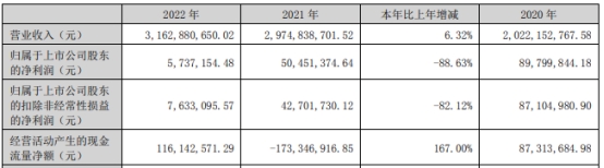 保立佳同时披露的2022年年度报告显示,公司去年实现营业收入31.63亿元,同比增长6.32%;归属于上市公司股东的净利润573.72万元,同比下降88.63%;归属于上市公司股东的扣除非经常性损益的净利润763.31万元,同比下降82.12%;经营活动产生的现金流量净额1.16亿元,同比增长167.00%。