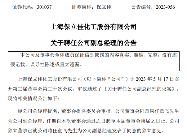 2023年5月17日晚间,上海保立佳化工股份有限公司(SZ 301037)发布关于聘任公司副总经理的公告。