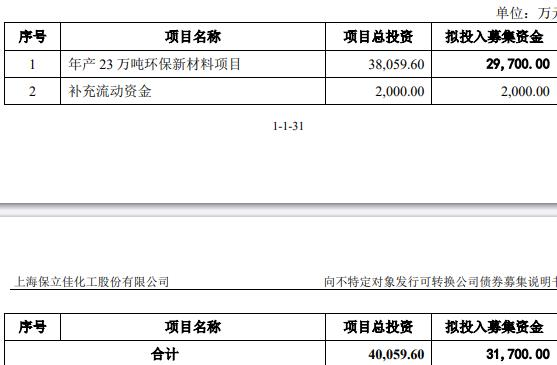 保立佳1月5日披露的《向不特定对象发行可转换公司债券募集说明书》显示,本次发行募集资金总额不超过人民币31,700.00万元(含本数),扣除发行费用后将投资于年产23万吨环保新材料项目和补充流动资金。