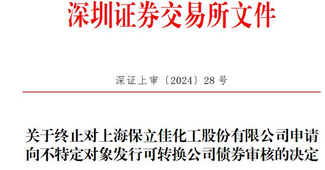 深交所于2023年6月27日依法受理了保立佳向不特定对象发行可转换公司债券的申请文件,并按照规定进行了审核。2024年1月31日,保立佳和保荐人国泰君安证券股份有限公司向深交所提交了《上海保立佳化工股份有限公司关于撤回向不特定对象发行可转换公司债券的申请》和《国泰君安证券股份有限公司关于撤回上海保立佳化工股份有限公司向不特定对象发行可转换公司债券的申请》。根据《深圳证券交易所上市公司证券发行上市审核规则》第二十条、《深圳证券交易所股票发行上市审核规则》第六十二条的有关规定,深交所决定终止对保立佳申请不特定对象发行可转换公司债券的审核。