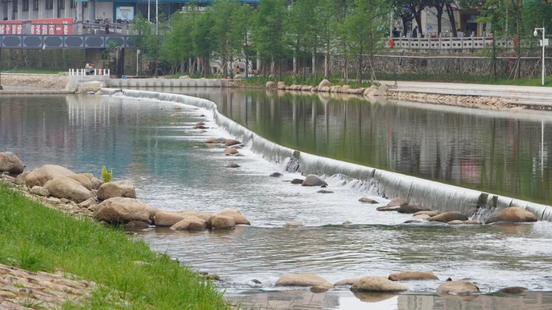 公司创新借鉴都江堰鱼嘴分水堤的“四六”分水设计,结合蓄水及生态需求创造性构建“二八”分水纵向分流堰,同一河段实现动静双重生态环境,呈现出充满深圳创新元素的全新滨水公共空间。