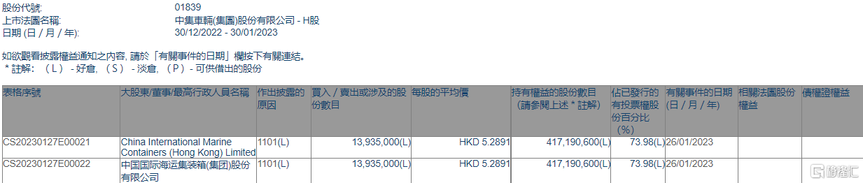 根据联交所最新权益披露资料显示,2023年1月26日,中集车辆(01839.HK)获中国国际海运集装箱(集团)股份有限公司在场内以每股均价5.2891港元增持1393.5万股,涉资约7370.36万港元。