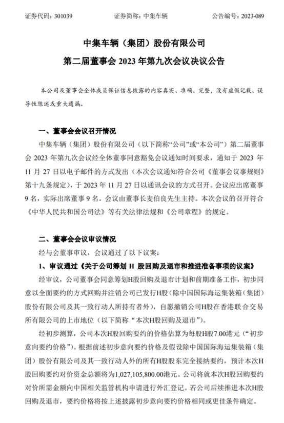 在11月28日,公司宣布停牌,晚上就发布在公司举行的11月27日董事会会议上,董事会已经批准了要回归公司所有已发行H股,而此次回购H股的交易总代价为10.27亿港元。按照目前中集车辆的股份来看,公司发行的总股本为20.17亿股,包括5.64亿股H股及14.54亿股A股。