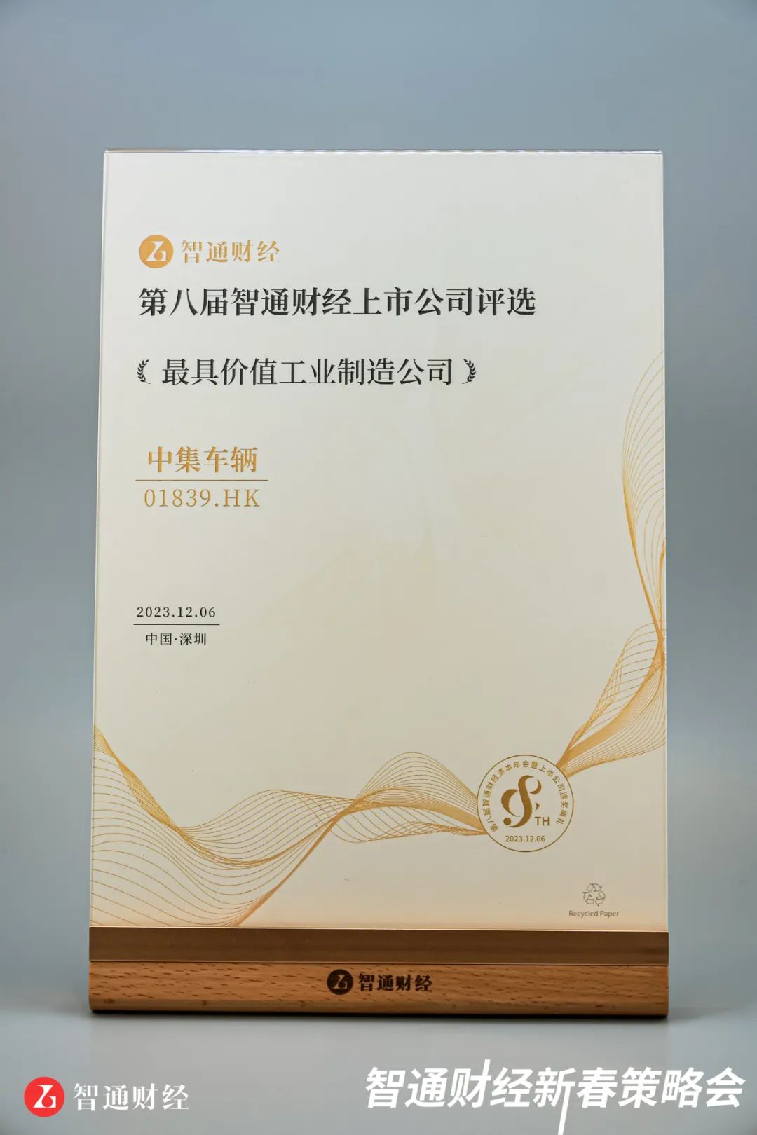 12月,在第八届智通财经资本市场年会暨上市公司颁奖典礼上,中集车辆凭借其高质量发展战略和领先的行业技术,荣获了“最具价值工业制造公司奖”。