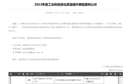12月,国家工信部公布了2023年度工业和信息化质量提升典型案例公示名单,共有129家企业成功入选,中集车辆旗下凌宇汽车“专用车辆智能涂装质量提升案例”成功入选“质量技术创新应用——质量控制”方向典型案例,属行业内唯一获此荣誉的企业。