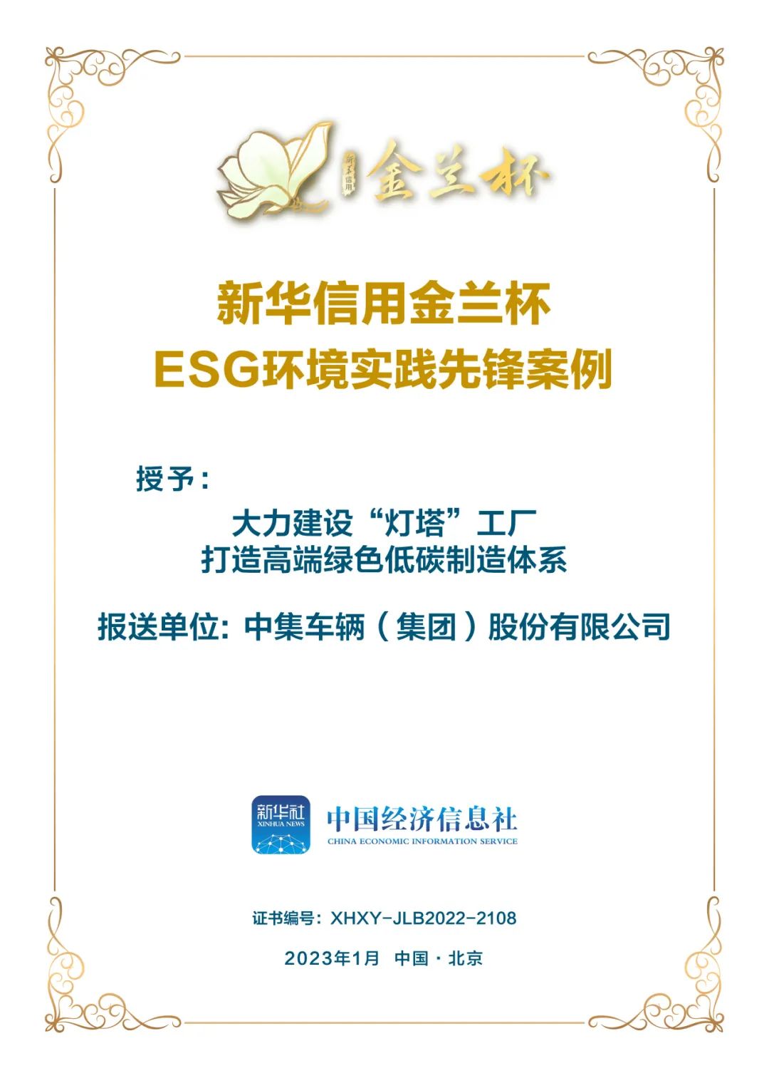 1月,中集车辆《大力建设“灯塔”工厂,打造高端绿色低碳制造体系》荣获“新华信用金兰杯”ESG环境实践先锋案例。