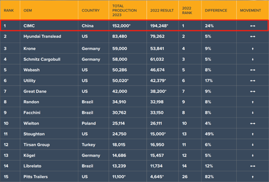 9月,全球半挂车知名杂志Global Trailer正式公布2023年全球前50名半挂车制造商按产量排名数据。作为榜单上唯一的中国企业,全球半挂车及专用车高端制造龙头中集车辆以近15.20万辆的产量独占鳌头。自2013年开始,中集车辆已连续十一年蝉联半挂车生产制造企业全球第一。