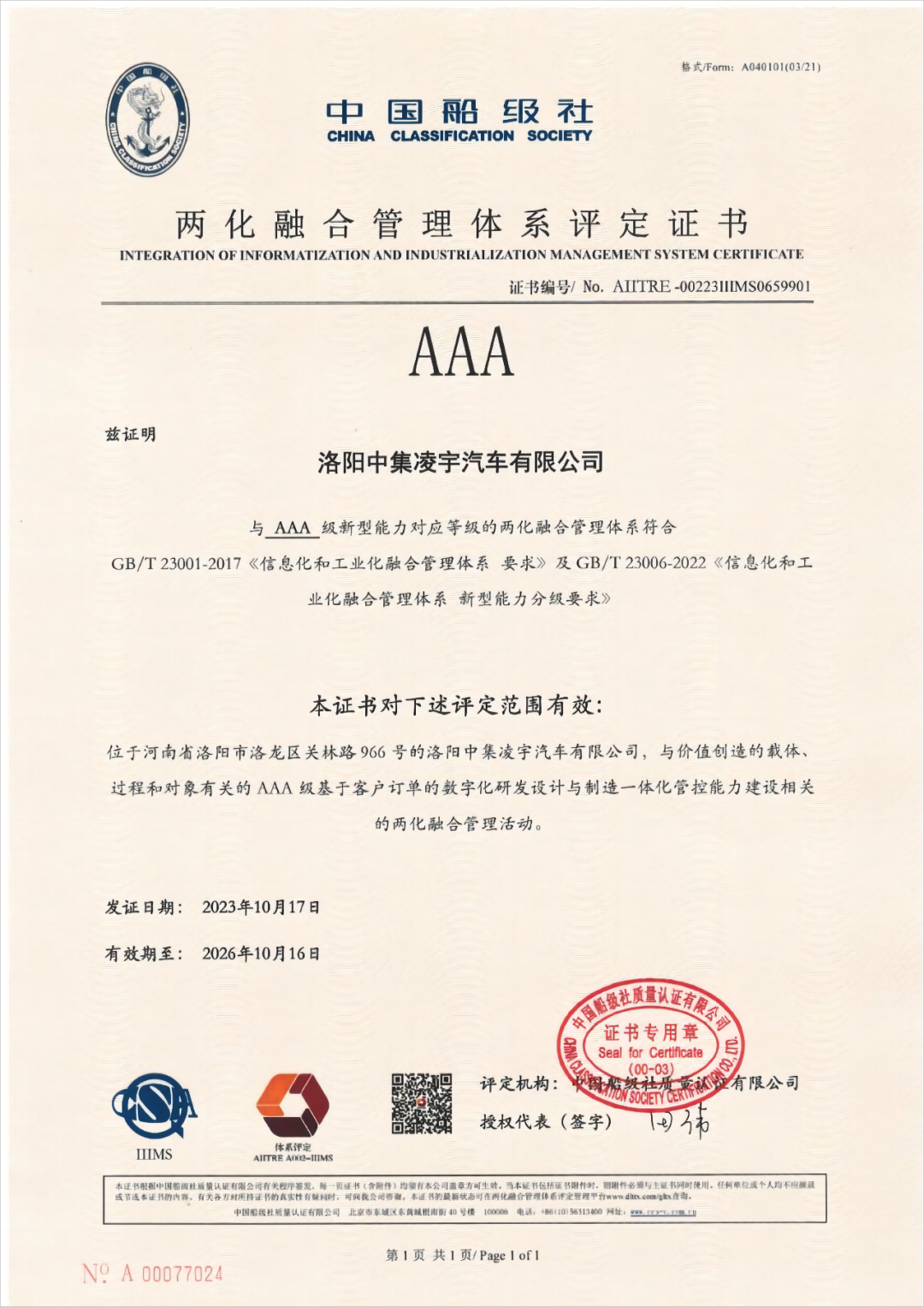 12月,中集车辆旗下凌宇汽车获得AAA级“两化融合”管理体系评定证书。“3A”级是该体系可申请认证的最高等级,凌宇汽车凭借先进管理能力成为行业首家、河南省第7家、洛阳市第3家获得此认证的企业。