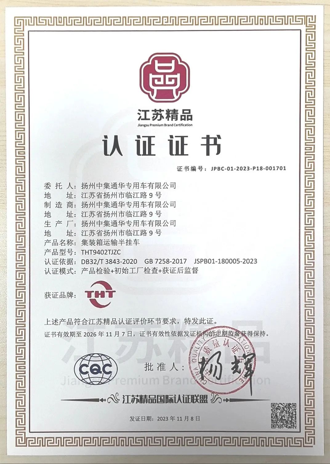 中集车辆旗下扬州通华积极参与“江苏精品”品牌培育活动,打造“江苏精品”品牌。2023年10月,一次性通过了江苏精品国际认证联盟对公司开展的现场审核,11月成功获得“江苏精品”认证证书。