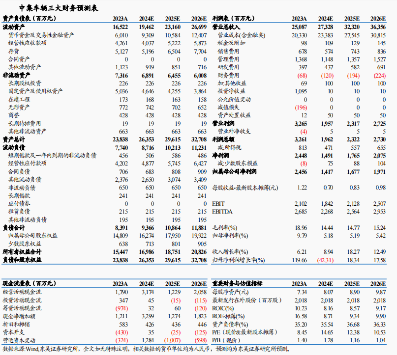 考虑公司全球半挂车龙头地位稳固,全球稳定发展,我们维持公司2024~2026年盈利预测,营收分别为273/323/364亿元,归母净利润分别为14.2/16.8/19.7亿元,对应EPS分别0.7/0.8/1.0元,对应PE为15/12/11倍,维持“买入”评级。