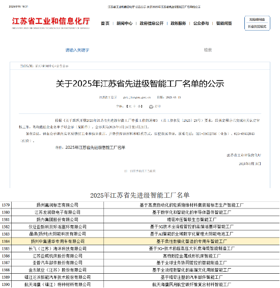 近日,江苏省工业和信息化厅正式公布了2025年江苏省智能工厂(先进级)名单。扬州通华专用车有限公司荣膺“2025年江苏省先进级智能工厂”称号。这一荣誉既是对公司在“智改数转网联”战略下取得成果的高度认可,更是对公司积极践行中集车辆“星链计划”,全面构建新质生产力,全球输出新质生产力,推动实体经济和数字经济深度融合的充分肯定。