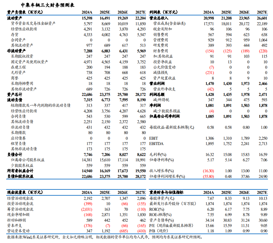 考虑到北美半挂车市场尚未企稳回升,我们下调公司2025/2026年盈利预测至10.91/15.03亿元(原16.8/19.7亿元),给予2027年盈利预测18.78亿元,2025~2027年对应EPS分别0.58/0.80/1.00元,对应PE为15.59/11.31/ 9.05倍,考虑到公司龙头地位显著,25年有望维持高分红,当前估值处于低位,25H2及26年销量及利润有望企稳回升,维持“买入”评级。