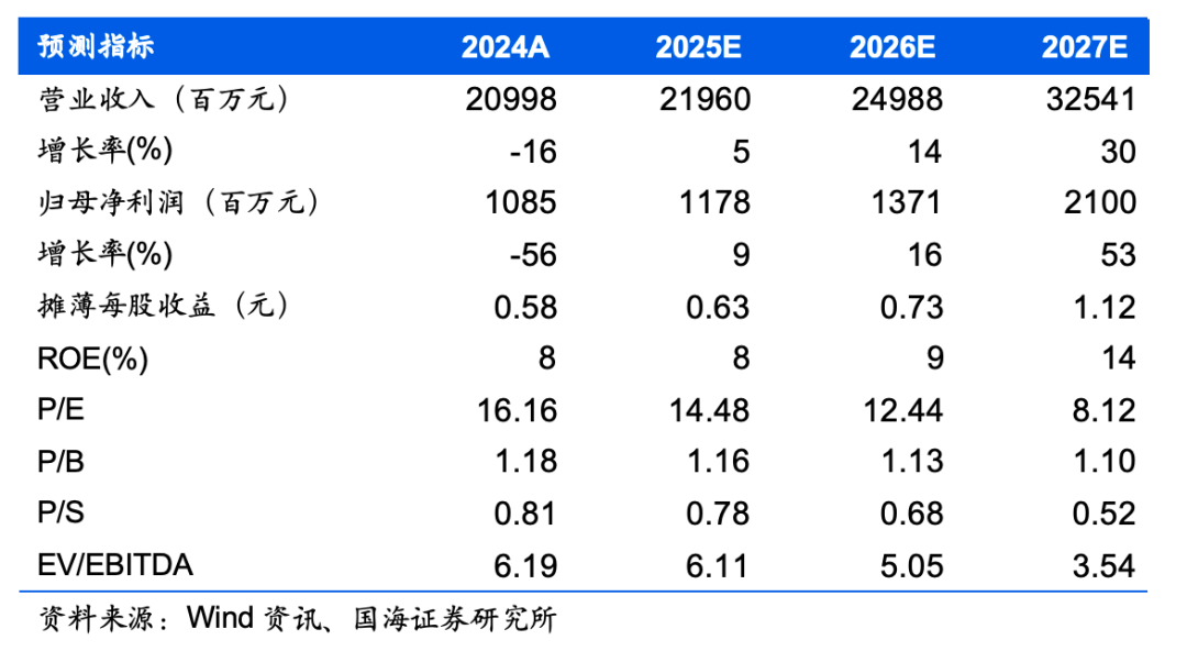 公司兼具行业向上复苏的贝塔与龙头高质量发展的阿尔法,我们预计公司2025-2027年实现营业总收入220、250与325亿元,同比增速5%、14%与30%;实现归母净利润11.8、13.7与21.0亿元,同比增速为9%、16%与53%;EPS为0.63、0.73与1.12元,对应当前股价的PE估值分别为14、12与8倍,维持“增持”评级。