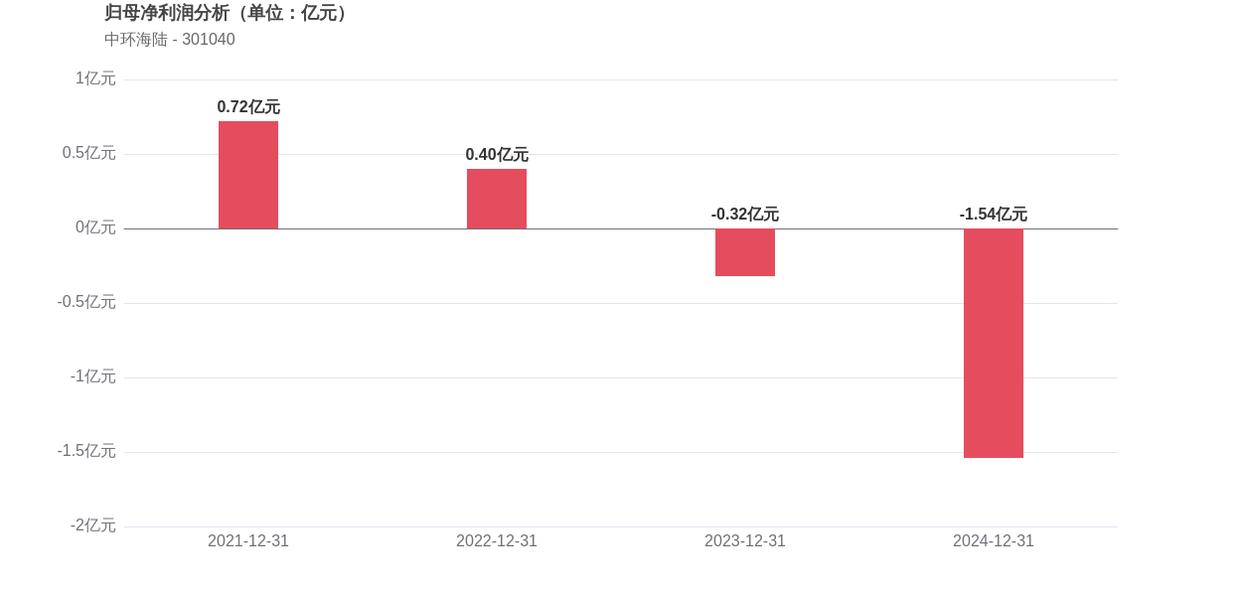 中环海陆上市的2021年,当年实现归母净利润0.72亿元。截至最新完整财年的2024年,公司实现-1.54亿元的归母净利润,近年累计下降了312.17%。这4年间,中环海陆有2年出现亏损。