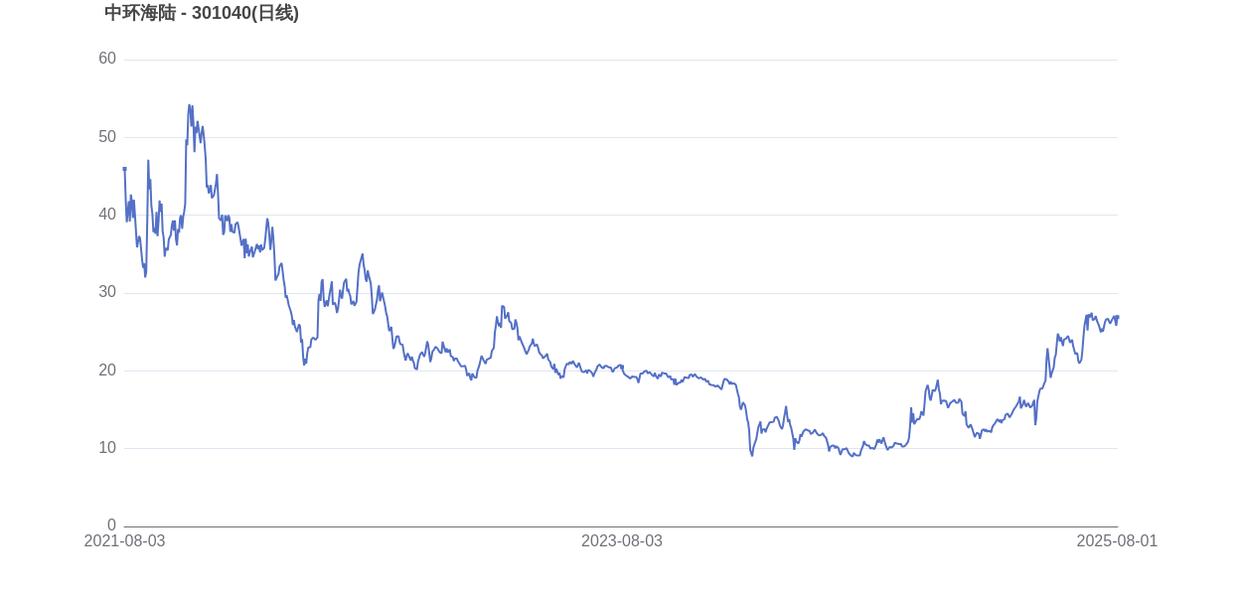 中环海陆自2021年08月03日上市至今,已迎来4周年。从上市首日收盘价为45.96元、市值45.96亿元,到如今市值达到26.91亿元。