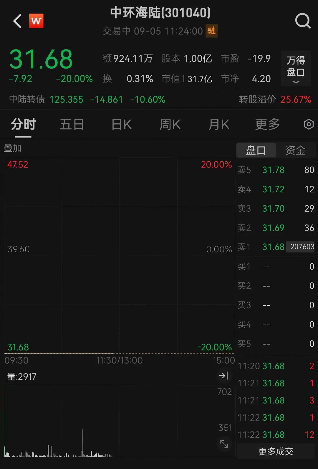 今日复牌的中环海陆(301040)开盘即“20CM”跌停,截至发稿时,该股股价暂报31.68元/股。今年以来,中环海陆的股价一路“飙升”,从探底的10元左右涨至30多元,年内区间涨幅超过150%。