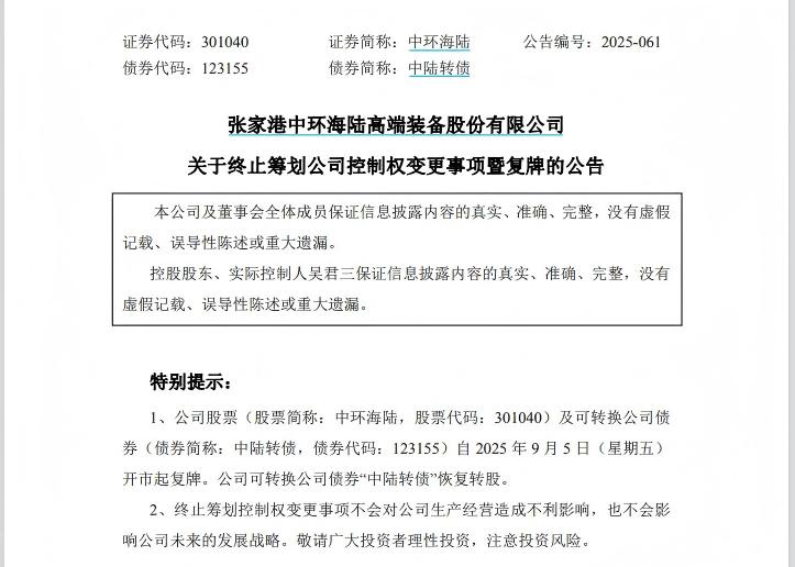 昨日晚间,中环海陆发布公告称,因公司控股股东、实际控制人吴君三与交易对方就公司未来发展安排未达成一致意见,经相关方协商一致,决定终止本次控制权变更事项。公司股票及可转债于2025年9月5日复牌。