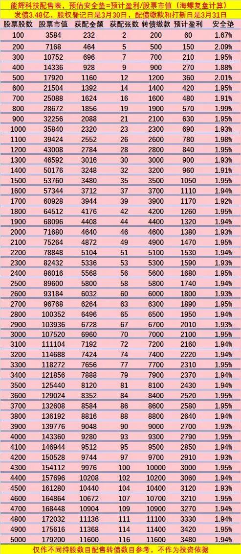 本次发债3.48亿,股权登记日是3月30日,配债缴款和打新日是3月31日,每股配售2.32元,不考虑大幅炒作的情况下,预计每10张转债赚300元,计算得到不同股数的安全垫如下: