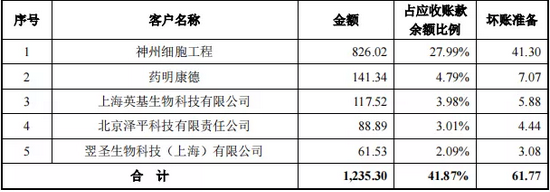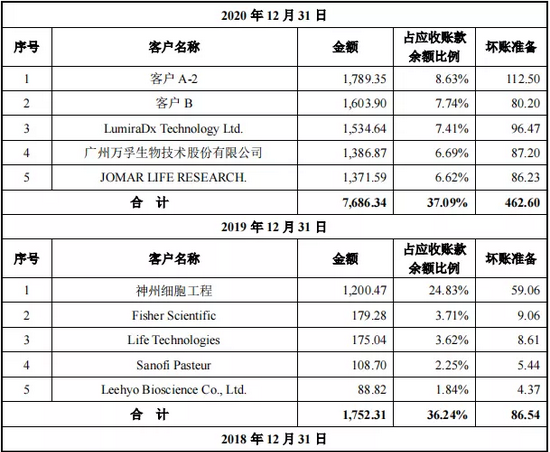 特别是在2019年,公司的应收账款逾期比例甚至超过了50%。在逾期应收账款持续增长的同时,与之一同上涨的还有坏账准备,2017年到2019年,公司的坏账准备从602.6万元飙升至1752.31万元,暴涨3倍,这其中,作为第一大客户的神州细胞就占据了1200.47万元的坏账准备。