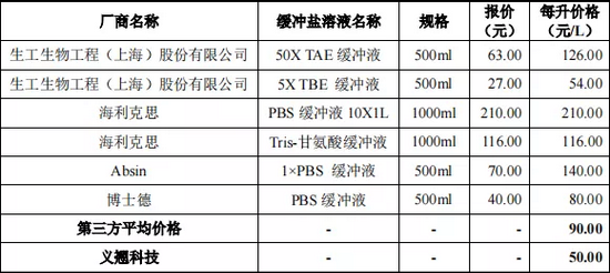 之所以义翘神州在去年没有进入前五大供应商名单,对“兄弟公司”提供显著低于市场价的技术服务和商品是重要因素之一。以缓冲盐溶液为例,这是一种有能够维持实验体系的pH值等理化性质相对稳定的溶液。2018年1月-2019年6月,发行人以50元/L的价格向“兄弟公司”子公司销售缓冲盐溶液,累计销售金额为168.02万元,累计销量为3.88万升。