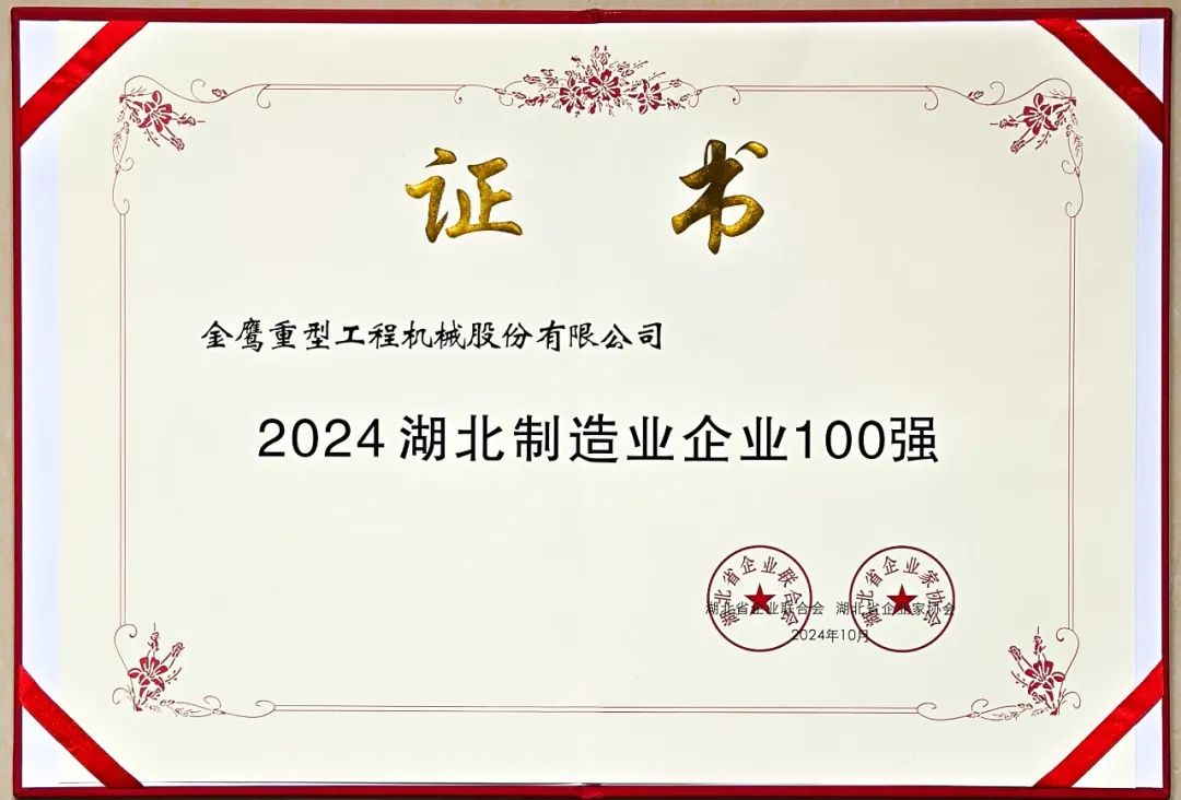 12月11日,湖北省企业联合会、省企业家协会发布了“2024湖北企业100强、湖北制造业企业100强、湖北服务业企业100强”名单,金鹰重型工程机械股份有限公司名列湖北制造业企业100强。这是公司连续第二年名列该榜单。