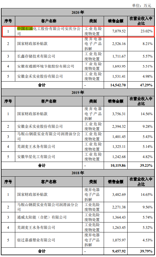 招股书显示,2020年中国石油化工股份有限公司安庆分公司为超越科技第一大客户,对其销售金额为7079.52万元。公司第二大客户为国家财政补贴、第三大客户销售额为1711.67万元,均无法达到7000万元的体量。
