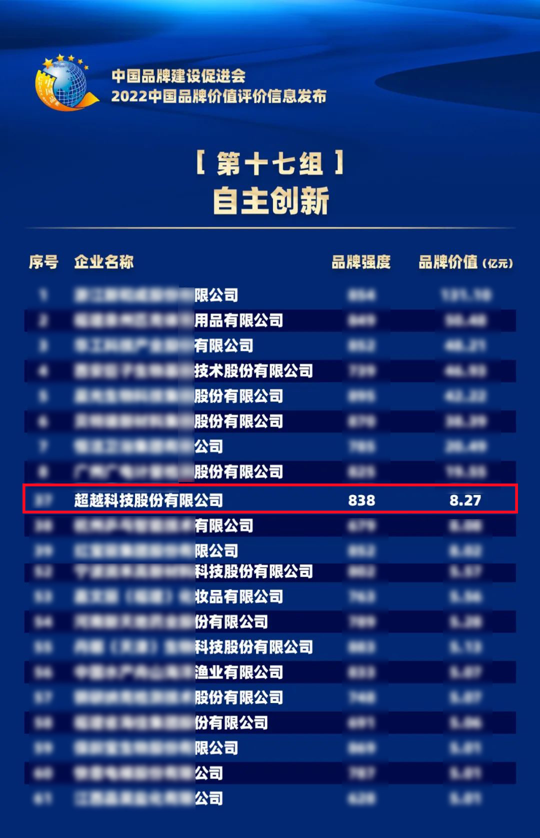 近日,中国品牌建设促进会、中国资产评估协会、新华社民族品牌工程办公室等单位在京联合发布“2022中国品牌价值评价信息”。全国61家企业登榜“自主创新”品牌榜单,其中山东省共有7家,超越科技首次参评并位居前列,彰显自主知识产权和核心技术实力。