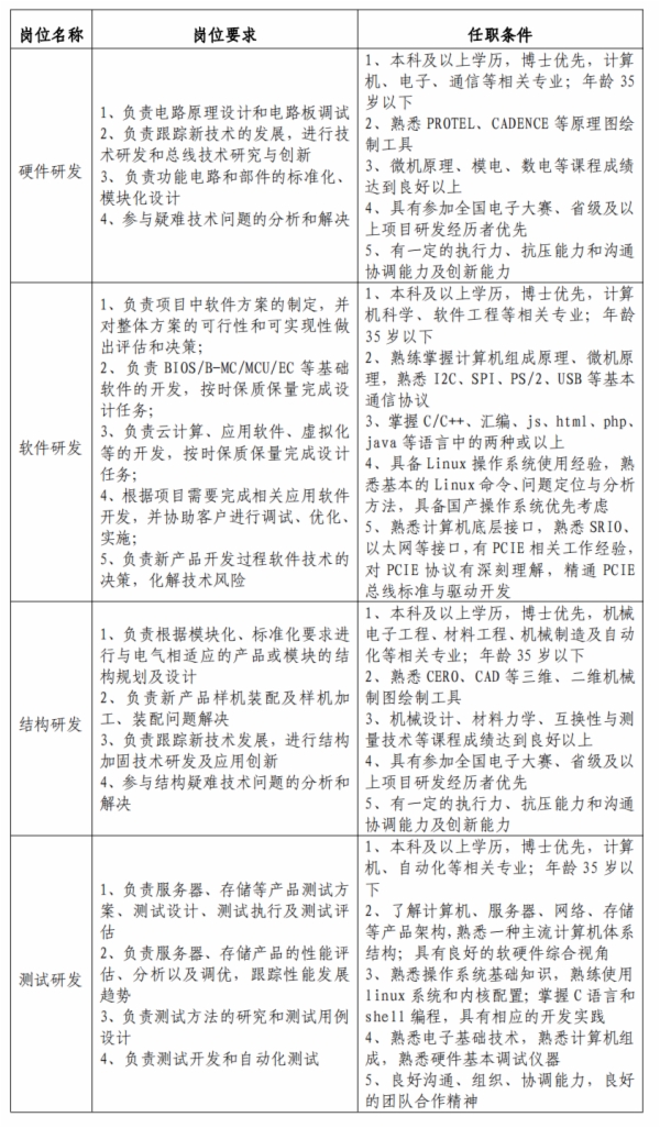 超越科技股份有限公司(简称“超越科技”),品牌名称超越申泰,是中国自主可靠算力引领者。公司是山东省国有资产投资控股有限公司权属企业,成立于1996年,是工信部专精特新重点“小巨人”企业,有力保障了“天和”核心舱发射、神舟十六号发射等国家级重大工程项目。超越科技面向特种、信创、工控三大行业,形成涵盖计算机、服务器、存储、网络、云平台、数据平台等在内的全栈解决方案,在特种数据中心算力市场稳居业界领先地位;信创市场蝉联国产整机十大品牌,产品成功应用于首批全国产营业厅样板示范、首批教育信创应用;工控市场 4U数据通信网关机市场占有率业界领先。超越科技在业界最早建立自主可控研发团队,打造高可靠加固计算技术、高效能智能计算技术两大核心硬科技,累计申请专利 2400余项。近年来荣获国家级科技进步奖等科技奖励10余项,获国家知识产权优势企业等认定,在科技部等主办的2022年中国创新方法大赛中斩获全国唯一金奖,成功入选首届“好品山东”、山东社会责任企业等,品牌影响力持续提升。根据业务发展需要,现面向社会公开招聘以下岗位,有关情况公告如下:一、招聘岗位硬件研发岗 6名;软件研发岗 7名;结构研发岗 2名;测试研发岗 1名。二、应聘条件