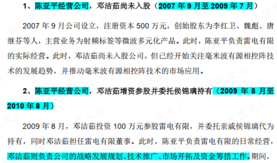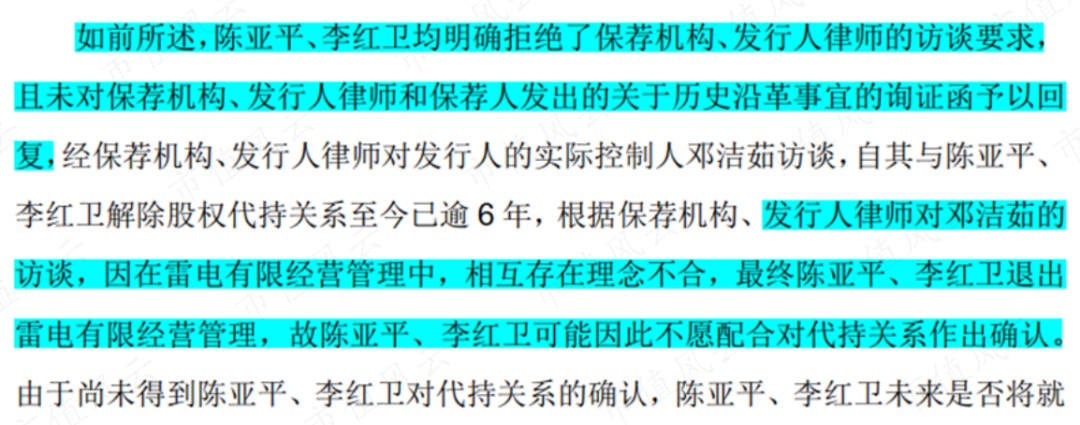 在保荐机构和律师希望就雷电微历史沿革对陈亚平和其妻子李卫红进行访谈时,陈亚平也表达了明确的拒绝,按邓洁茹方面解释,陈亚平退出时双方不愉快可能是主要原因。