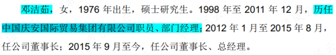 邓洁茹虽拥有硕士学历,但从参加工作时间判断,大概率是后来才读的,她从22岁就在中国庆安国际贸易集团有限公司任职,一路做到部门经理。