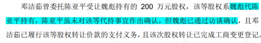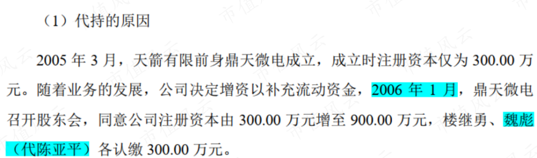 同雷电微力一样,而在天箭科技的历次股权变动中,陈亚平也一度使用了其妻子李卫红的亲属魏彪作为代持人。
