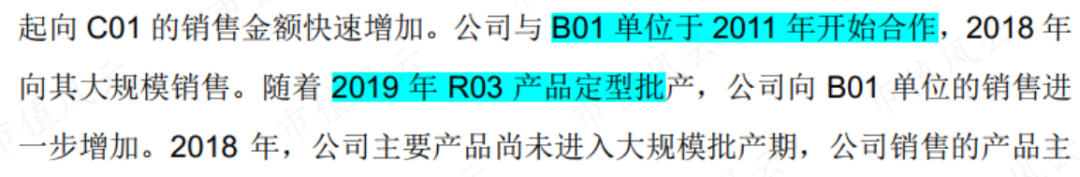 最后风云君想介绍另一个主要客户B01,除C01单位外,公司上市前另一主要客户,同样从2011年就开始合作,主要产品为2019年定型的R03产品。