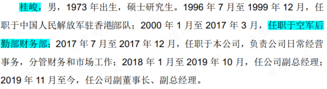 他2017年才加入公司,在此之前,现在驻港部队服役,随后自2000年开始在空军后勤部财务部工作长达17年,主要负责“军队预算经费管理、事业经费管理和资产管理等”。