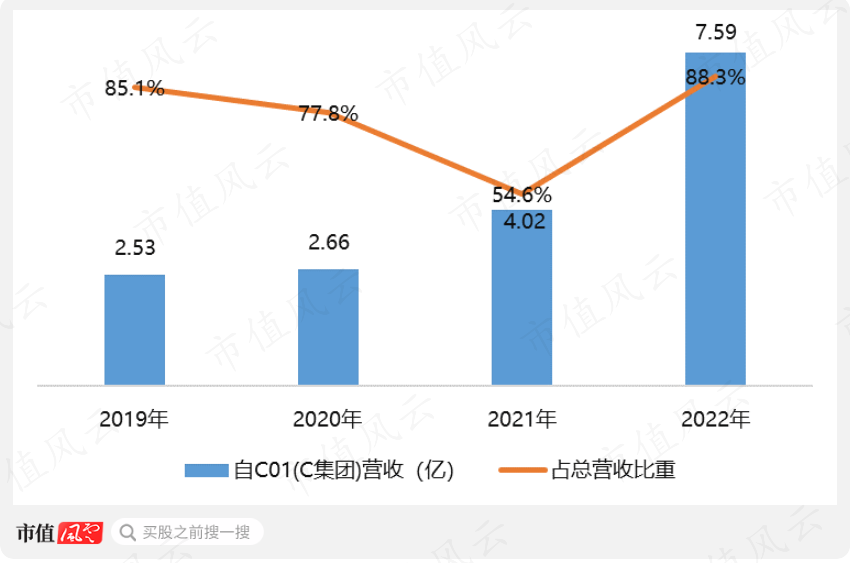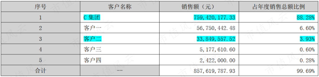 不过“客户一”在2022年就至少变为排名第3的“客户二”,营收贡献不超过3,385万元,同比最低下滑近90%,呈现出极大的波动性,反倒是C集团,2022年又贡献高达7.59亿的营收,同比增长89%,占当年总收入的比重接近90%。