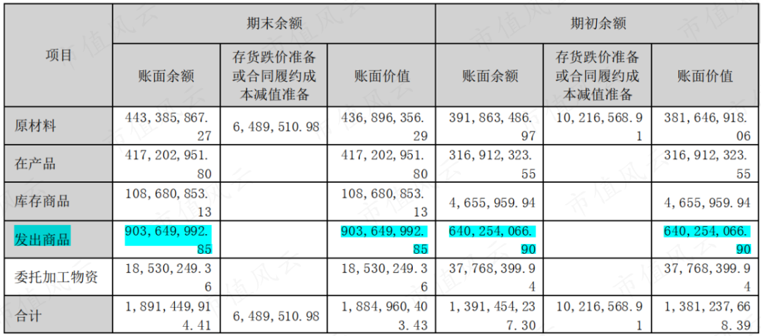 风云君发现,这主要跟存货结构有关,2022年底及2023年6月末,存货中增加的主要项目是发出商品,而并非原材料和产成品。截至2023年6月底,发出商品9.04亿,几乎占到存货余额的一半。