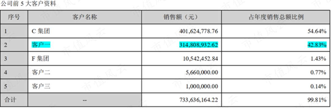 “客户一”首次以前5大客户的身份出现,并且一经亮相就光芒四射,以3.15亿屈居第2大客户,在C集团外,首次有第二个客户营收贡献过亿。