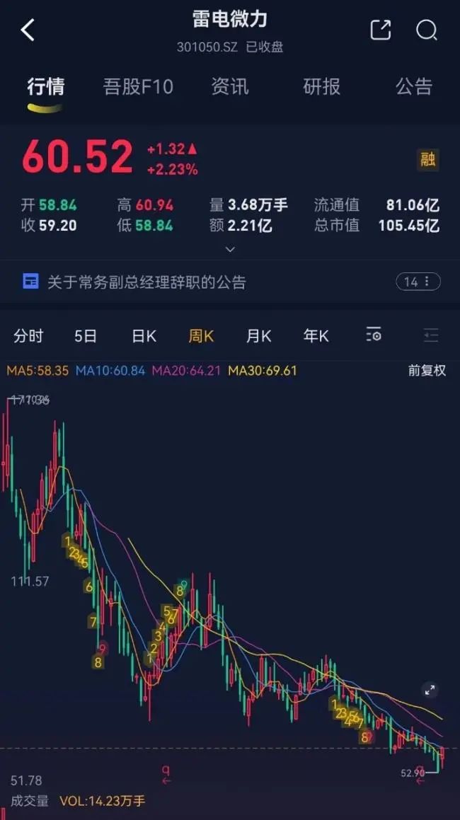 打开市值风云APP,雷电微力2021年8月24日上市,在经历过上市初期短暂的上涨后,便开启单边下跌模式,两年时间,股价较上市首日收盘价跌幅超60%,也已破60.64元/股的发行价。