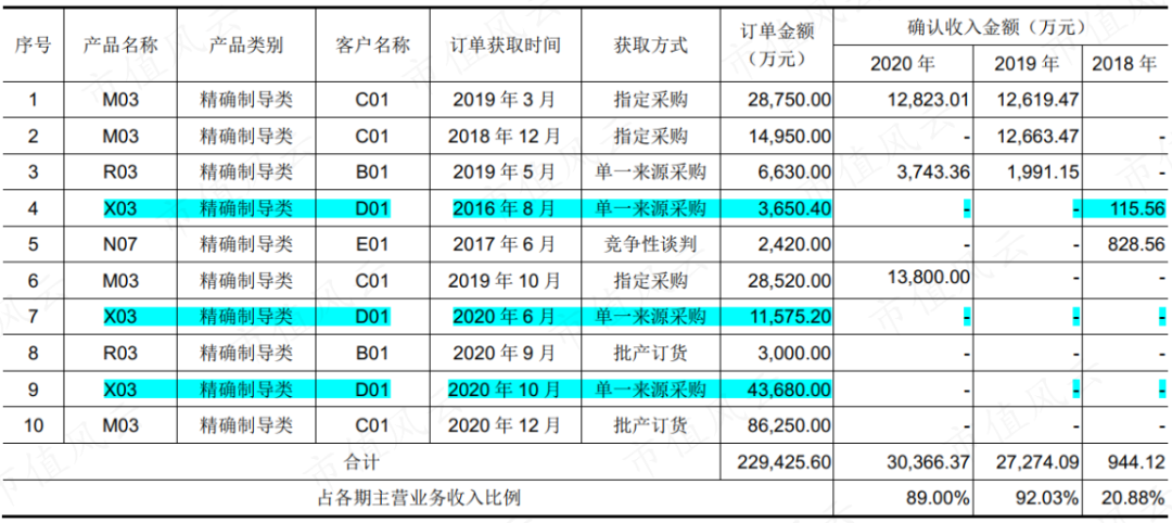 而2021年的客户一是谁,及其具体产品根据招股书也很容易推测出来,精确制导类X03产品,招股书中客户名称为D01,2020年四季度开始批量供货,之前仅在2018年确认了116万的收入。
