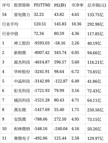 从行业市盈率排名来看,公司所处的半导体行业市盈率平均120.51倍,行业中值72.34倍,雷电微力排名第54位。